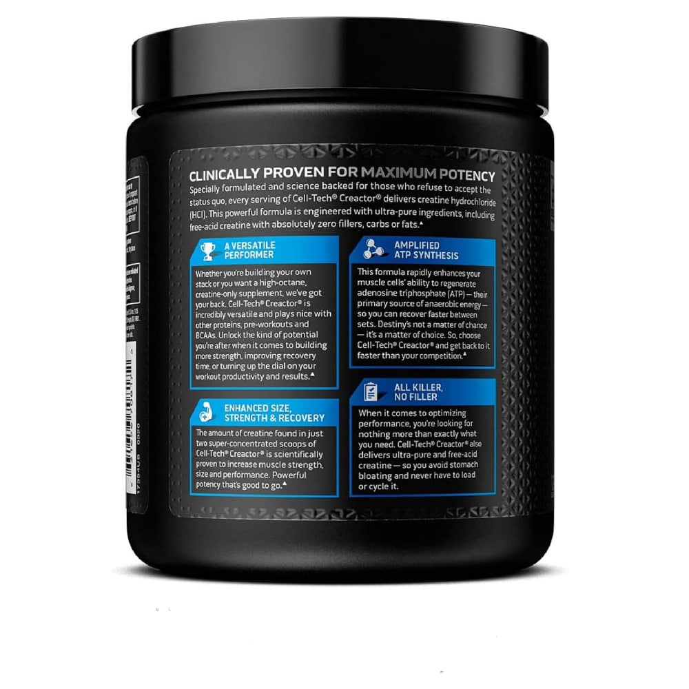 Cell-Tech Creactor یکی از پیشرفته‌ترین مکمل‌های کراتین از برند معتبر آمریکایی Muscletech است که با ترکیب خاصی از دو نوع کراتین پیشرفته – کراتین هیدروکلراید (Creatine HCl) و کراتین آزاد (Free-Acid Creatine) – طراحی شده است. این محصول بدون طعم عرضه می‌شود و قابلیت ترکیب آسان با هر نوع نوشیدنی دیگر را دارد.