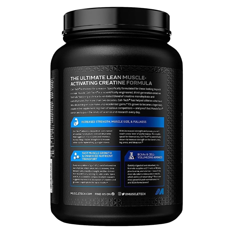 Cell-Tech از برند معتبر ماسل‌تک، یک فرمول تقویت‌کننده‌ی عضلانی پیشرفته است که با پشتوانه تحقیقات علمی طراحی شده تا نیاز ورزشکاران حرفه‌ای به رشد سریع عضلات، افزایش قدرت و تسریع در بازتوانی را به‌طور کامل پوشش دهد. این محصول ترکیبی بسیار دقیق از کراتین، کربوهیدرات‌های سریع‌الجذب، آمینواسیدهای شاخص و ترکیبات بهبوددهنده‌ی جذب را در خود جای داده تا عملکرد بدنی شما را در سطوحی فراتر از مکمل‌های کراتین معمولی ارتقاء دهد. اگر به‌دنبال یک مکمل علمی برای رشد عضلانی بدون چربی هستید، Cell-Tech انتخاب ایده‌آلی برای شما خواهد بود.